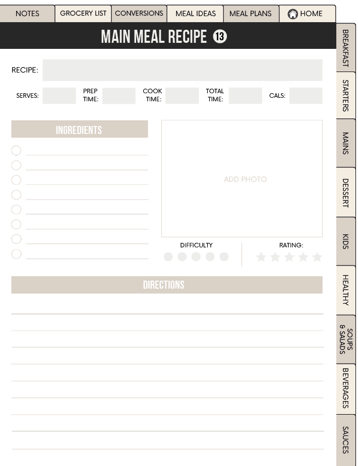Organize your meals and recipes effortlessly! This digital planner makes meal planning, shopping, and cooking simple and stress-free.