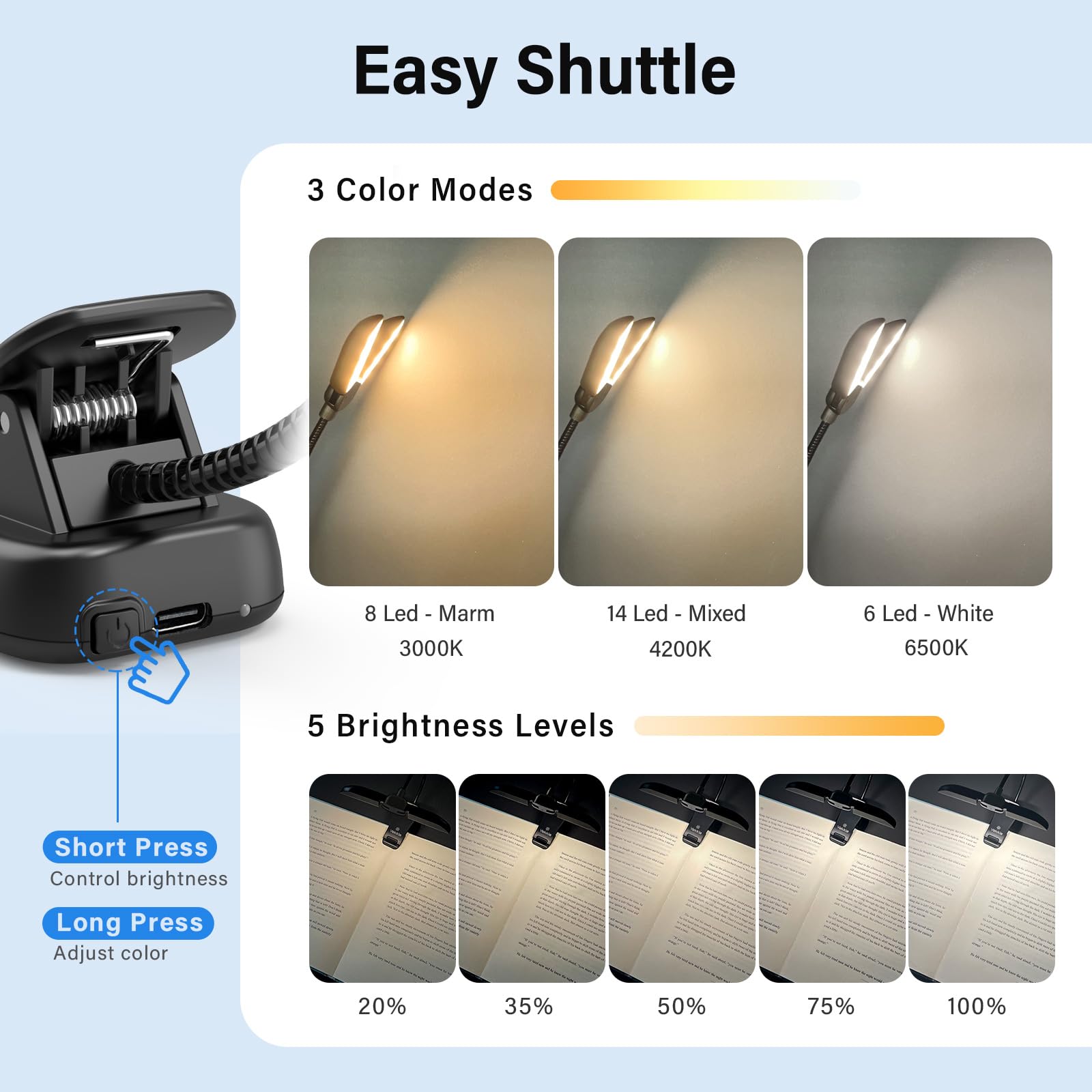 - [Product Quality Guarantee] FCC, CE, approved. Safe & Easy use. Product Box Contains: Book Reading Light x1, Type-C x1, User Manual x1. NOTE: No adapter included.